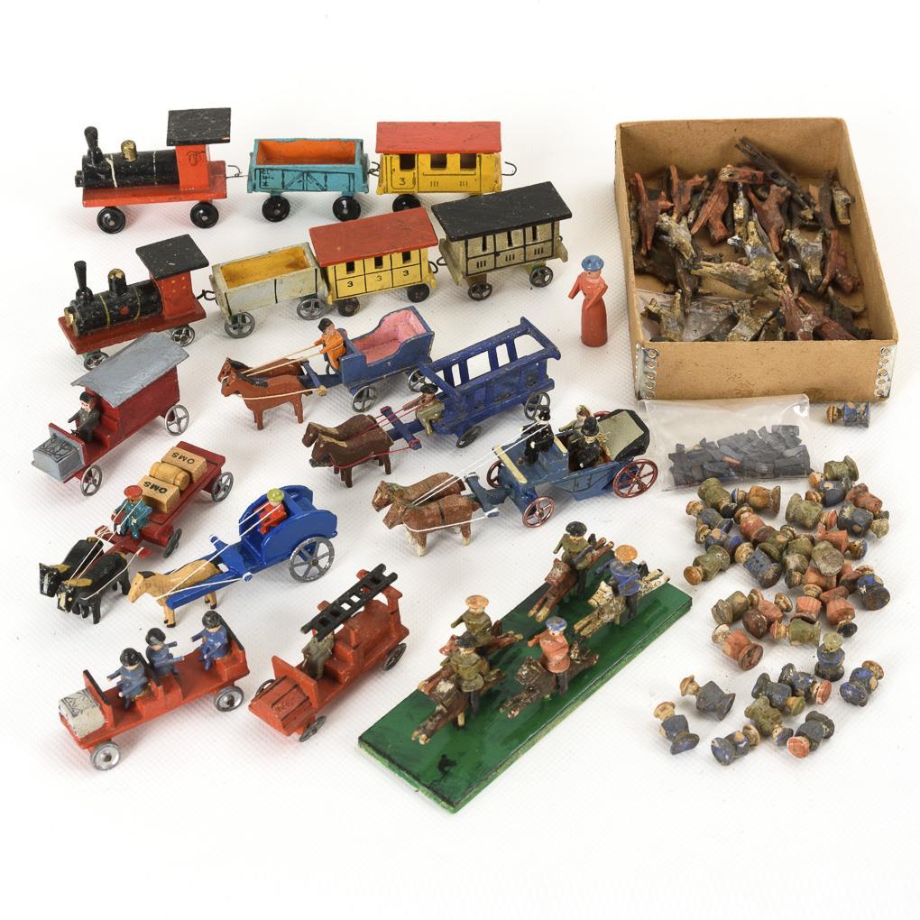 5 carriages (including wedding carriage), 2 trains, 2 fire engines, 1 truck, small cavalry / hunting. For good measure, box of figures in need of restoration (little horses, figure hulls, loose arms and legs). Traces of age, small defects.