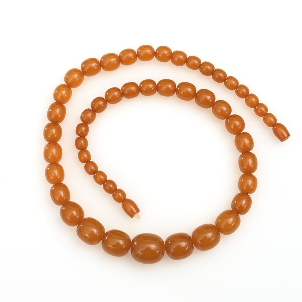 Lacing necklace with amber olives in the course, on screw clasp.