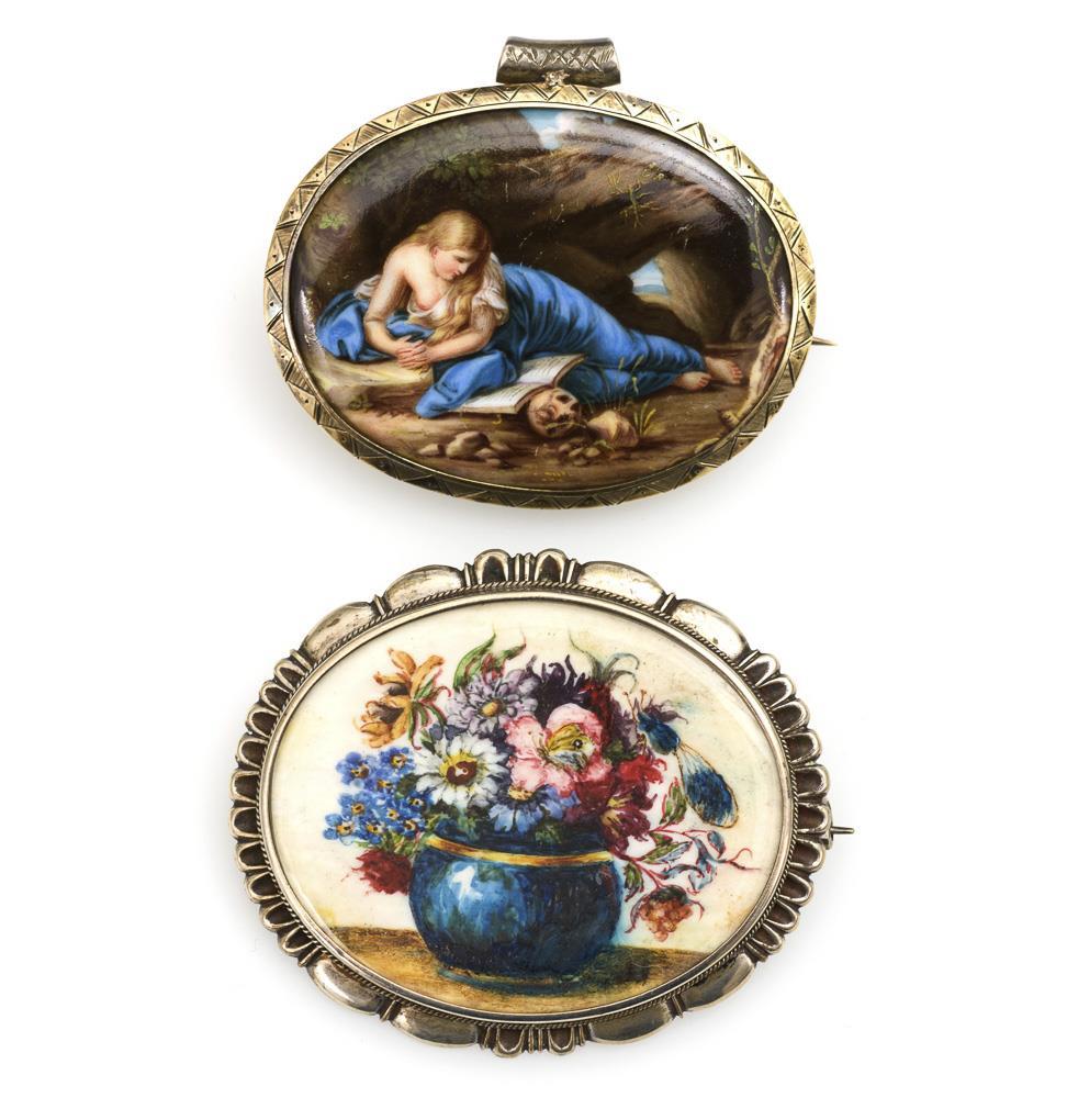 Fine painted motif of "Penitent Mary Magdalene" after Girolamo Patoni, in open bezel setting with supplemented eye-bar. Glazed framed bouquet of flowers in vase. Hook fasteners.