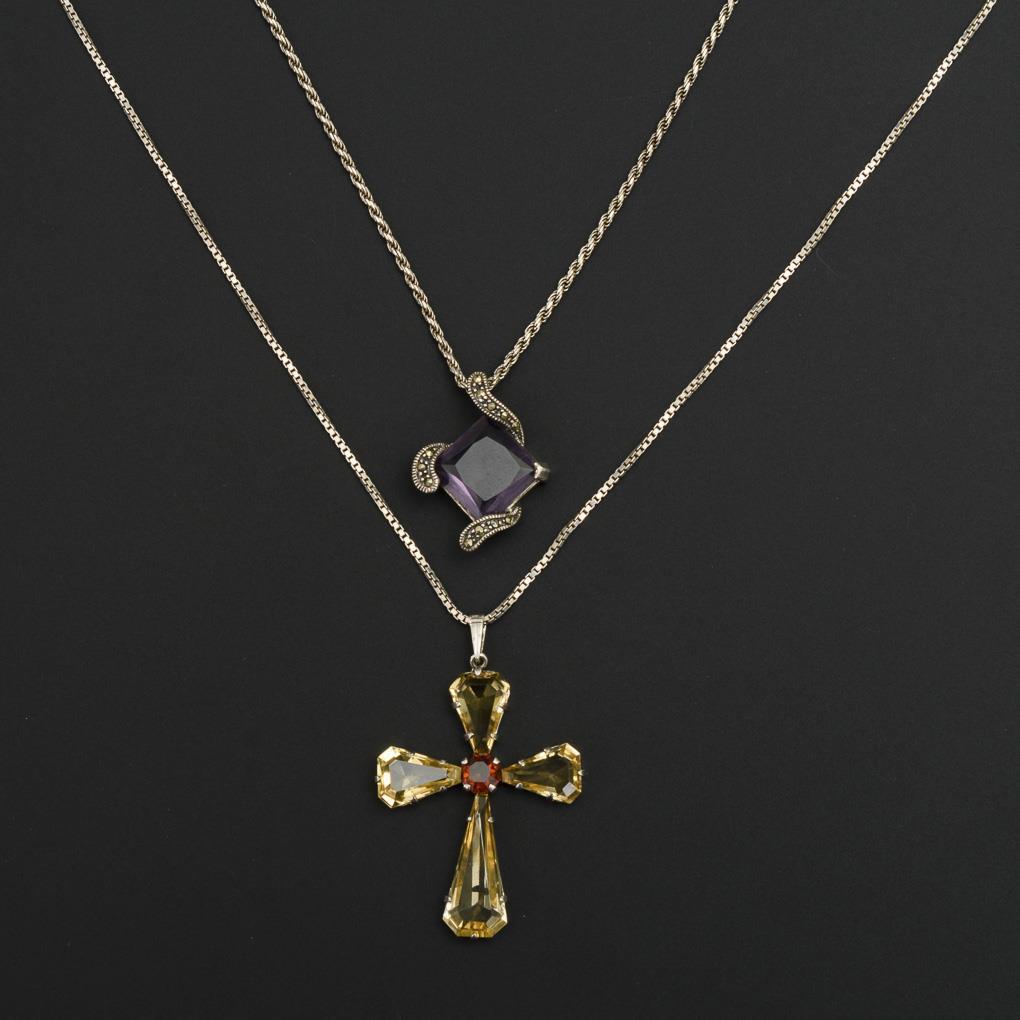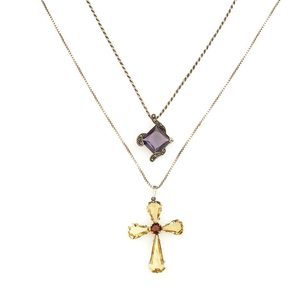 Cross pendant with citrines and garnet on Venetian chain with ring spring clasp. Pendant with purple stone and marcasites on cord chain with lobster clasp.