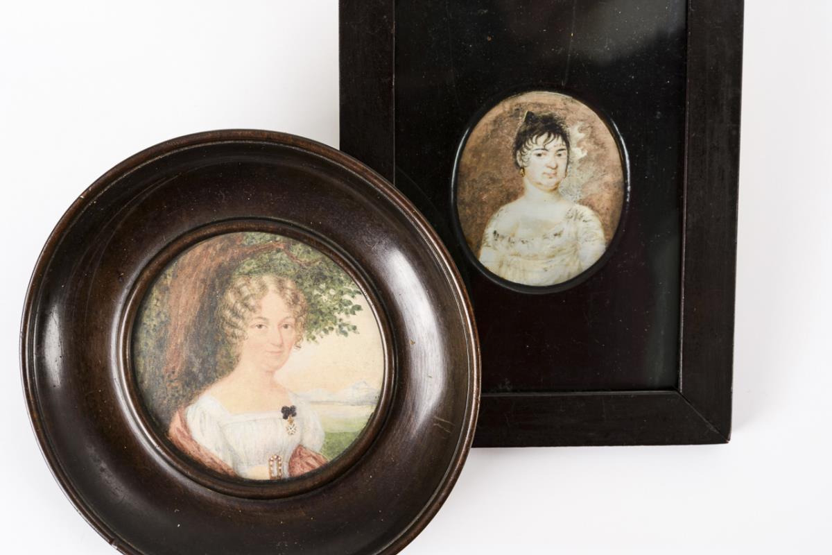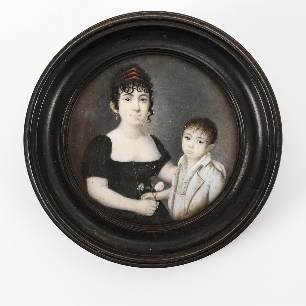 Mother with child each with flower in hand. / Oval portrait of a woman. / Tondo of a young woman under the tree at the mountain lake, wearing a (St. John?-) medal. 1 small missing part and hairline crack at the mother-child tondo, oval miniature more rubbed.