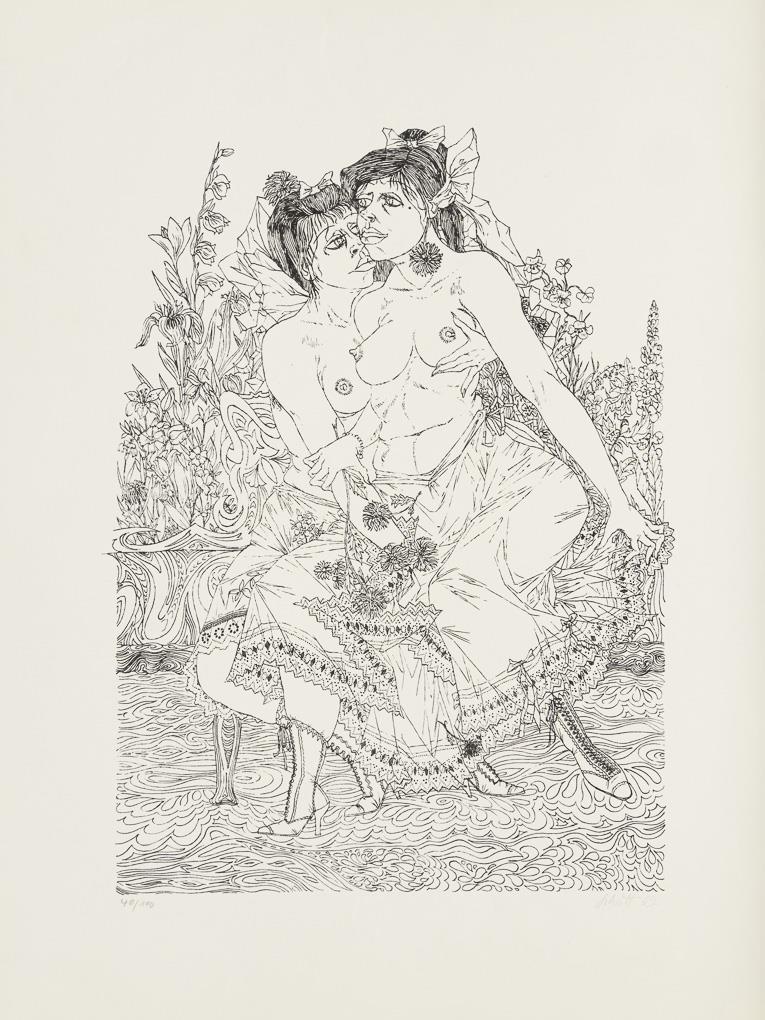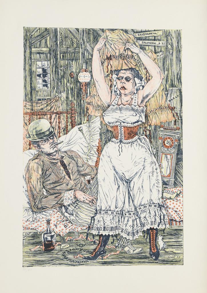 "Mackie Messer", zincograph, sheet: 59 x 43 cm, copy: 94/100, [19]69 |"Two lovely girls", lithograph, sheet: 56,5 x 43 cm, copy: 40/100, [19]69 | Lovely woman in seductive lingerie, zincograph, sheet: 58,5 x 43 cm, copy: 23/100, [19]69. Each somewhat creased.