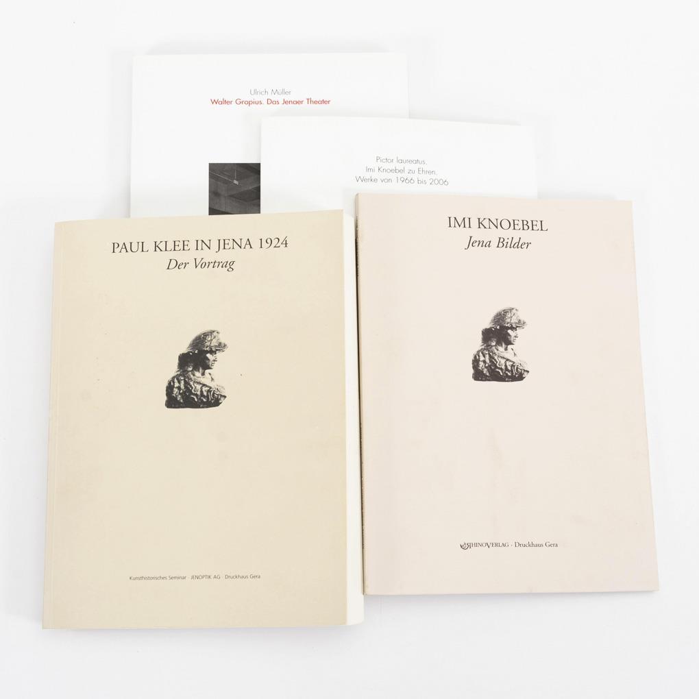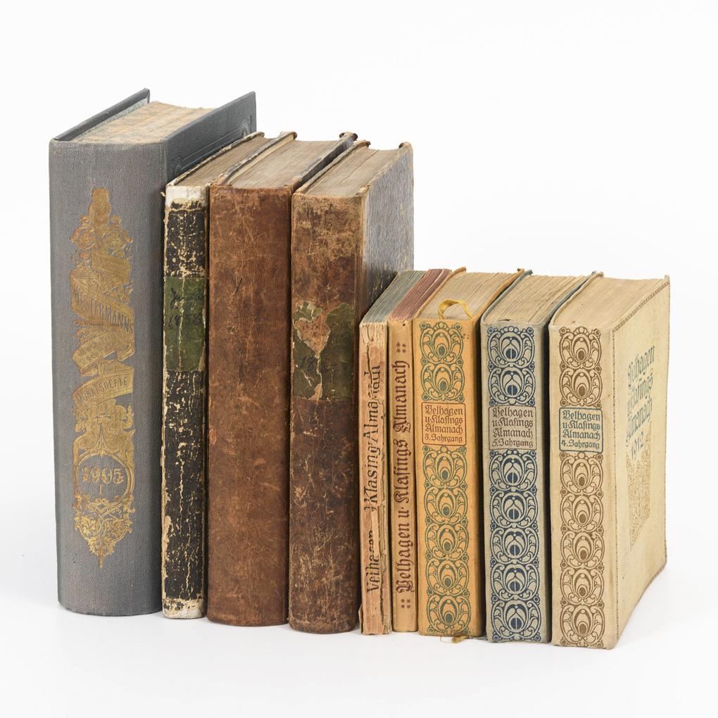 4x "Westermann's Illustrierte Deutsche Monatshefte"/ 5x "Velhagen und Klasing Almanach" from 1911, 1912, 1913, 1919, 1921. / Monatshefte - "A family book for the entire intellectual life of the present", with illustrations: Jan. to ? 1858; Aug 1864 - March(?) 1865(?); Oct.1869 - March 1870; Oct 1904-March 1905 / 4x "Minerva" - Jena writings on art history. 29 x 21 cm: Volume 3: "Imi Knoebel - Jena Bilder", edited by W. Hogrebe, M. Platen and F.-J. Verspohl, 1996. 73 pp. / "Paul Klee in Jena 1924 - The Lecture", Jena 1999, edited by T. Kain., M. Meister and F.-J. Verspohl. 388 pages. / Ulrich Müller: "Walter Gropius. The Jena Theater." Jena and Cologne 2006, 160 pp. / "Pictor laureatus. In Imi Knoebel's honor. Works from 1966 to 2006." Jena, Cologne 2006, 93 pages. Different covers, heavier signs of age and wear.