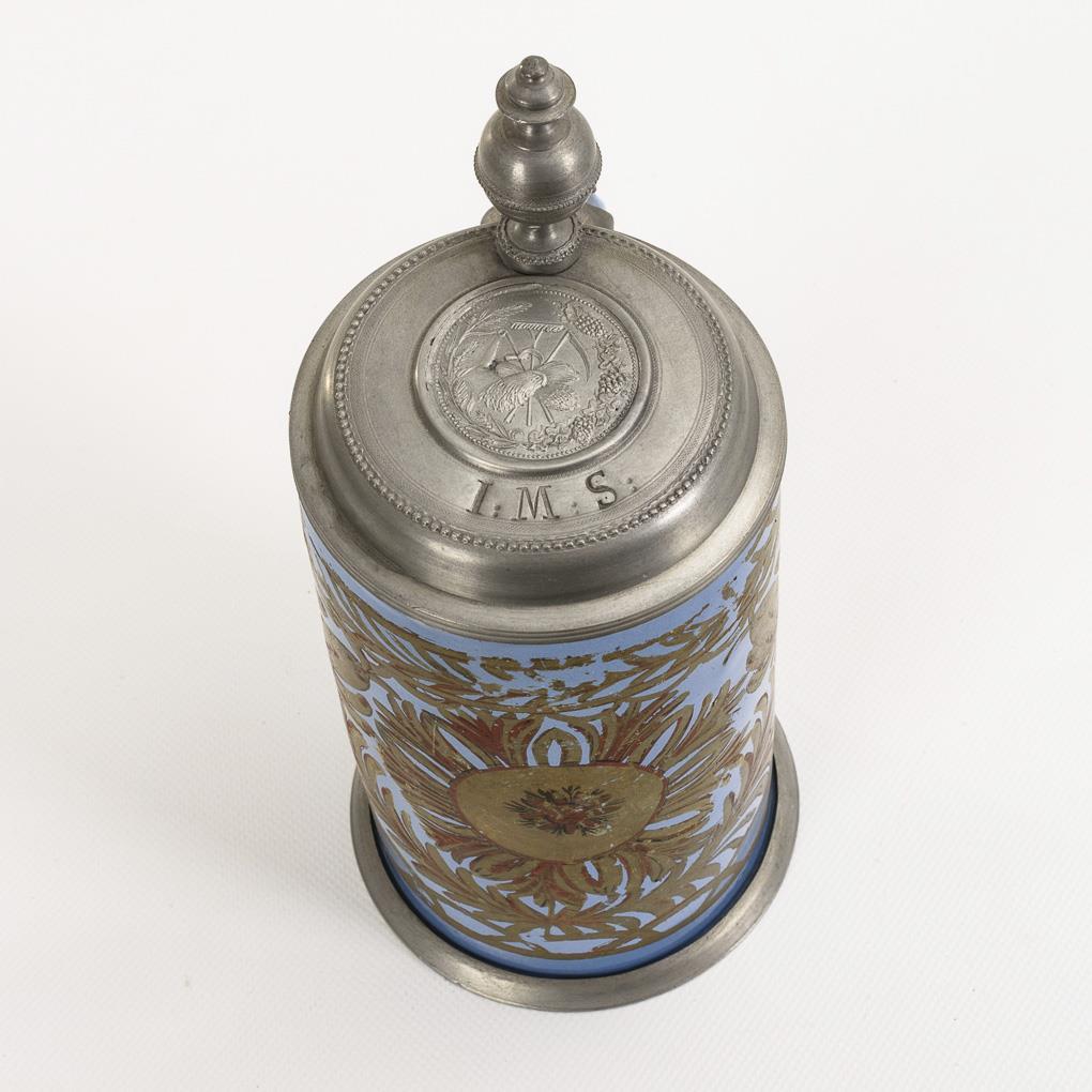 Cylindrical shape with ribbon handle. On the wall a large flower with fruit branches. Profiled pewter lid with relief plaque and ball pusher, engraved "IMS", hallmarked inside, pewter stand ring. Glaze and decorative rubbing, pewter mount loose, solder marks.