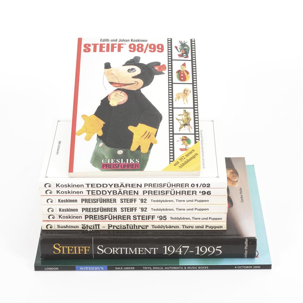 1x "Steiff assortment 1947-1995" by Günther Pfeiffer. / 7x price guide by Edith and Johan Koskinen (1989-2001). / 1x Sotheby's auction catalog (October 4, 2000). Price guide volume from 1992 double.