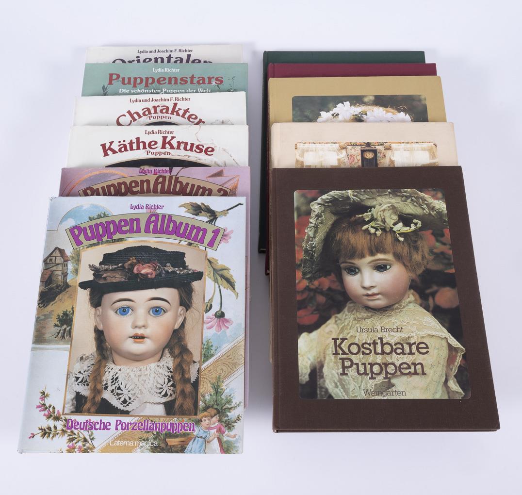 Lydia Richter: "German Porcelain Dolls", "French Porcelain Dolls", "Käthe Kruse Dolls", "Character Dolls", "Orientals" and "Doll Stars". / Sabine Reinelt: "Magic of character dolls", "Käthe Kruse", "Dolls and celluloid toys" / J. Kunz / U. Schneiders: "Beautiful old doll houses". / Ursula Brecht: "Precious Dolls". Signs of age and wear, cloth covers partly soiled.