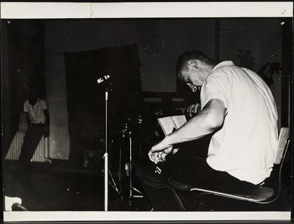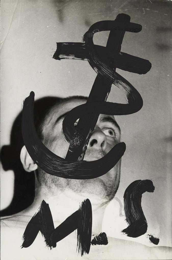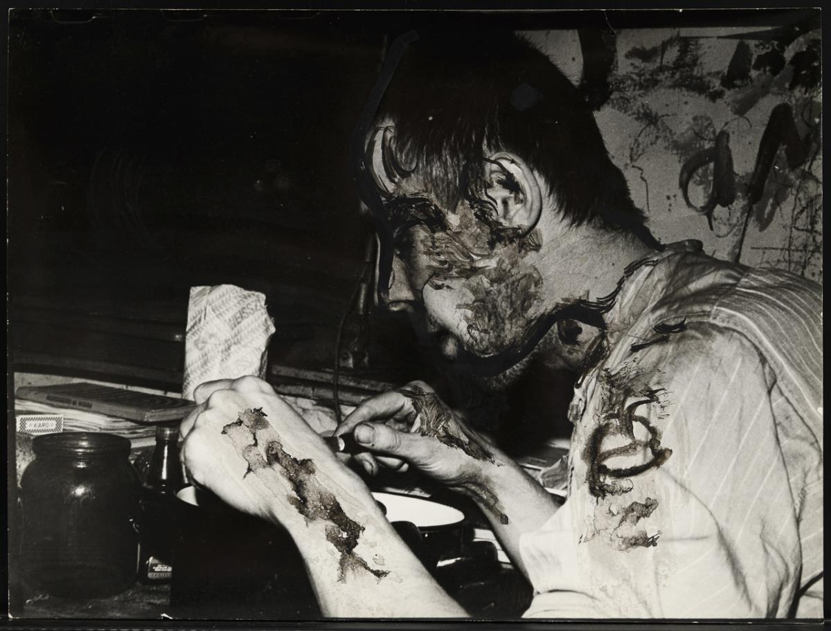 3 photographs of the artist during a performance, 2 of them painted over by the artist. Each creased, partly torn edges, small holes in the corners by attachments.