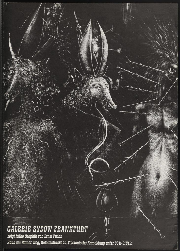 "Chagall" | "Gallery Sydow Frankfurt Roldán" | "Gallery Sydow Frankfurt Morell December '65" | "Gallery Sydow Frankfurt Ernst Fuchs" | "Rudolf Hausner. Das druckgraphische Gesamtwerk 30.8. 15.9. 1973 Kulturamt der Stadt Graz" | "Studio 69 Köln" | "Bele Bachem May 31 - June 18 1983 Bodley Gallery New York City" | "Mel Ramos Galeria Civica Moderna" | "der Akt bilder von claus weidensdorfer / skulpturen von eckard r. schwandt 15. august to september 25, 1992 galerie '88 hanau" | "Tapestries at Pace October 27th - November 30th 1974, Columbus, Ohio" and "Max Ernst 13 maig - 29 juny 1986 Fondació Joan Miró" | Kestner-Gesellschaft Schröder-Sonnenstern" | "Graffiti Issue 1 in October 1978: The 50s!" | "Caballero galerie voigt Nuremberg".