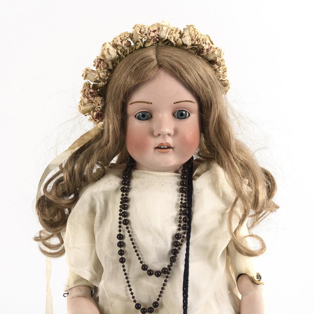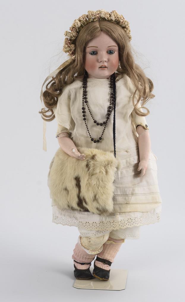 Blue sleeping eyes, inlaid blond brows, younger complemented blond wig. Leather body with cotter pin joints and porcelain forearms. White dress, flower wreath in the hair, black oilcloth shoes, muff of real fur. Head x-rayed: without defects. Body with defects and old repairs, original head cover and right eye with breakout, 1 thumb missing.