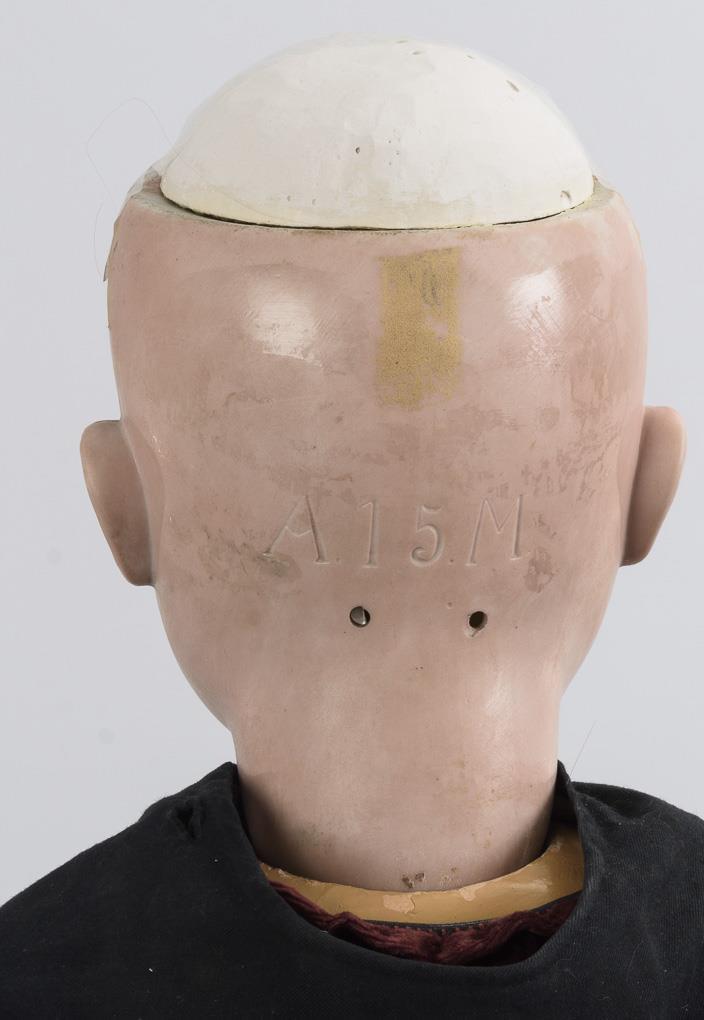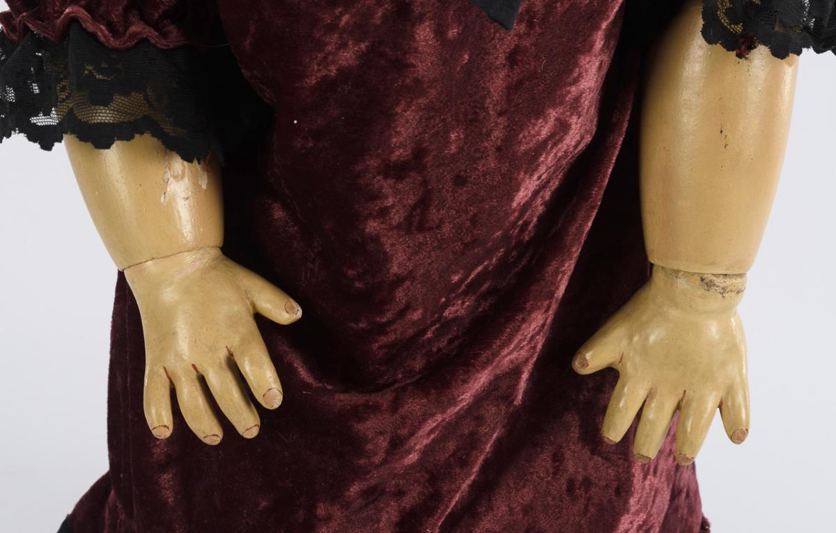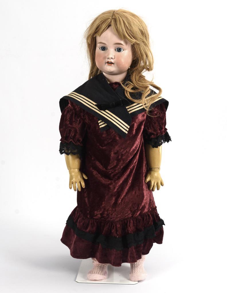 Crank head, blue sleeping eyes, blond human hair wig. 11-piece articulated body with 2-section torso. Red velvet dress with black sailor collar. Head x-rayed: without defects. Overpainted body with paint defects and restored hands, voice silenced.