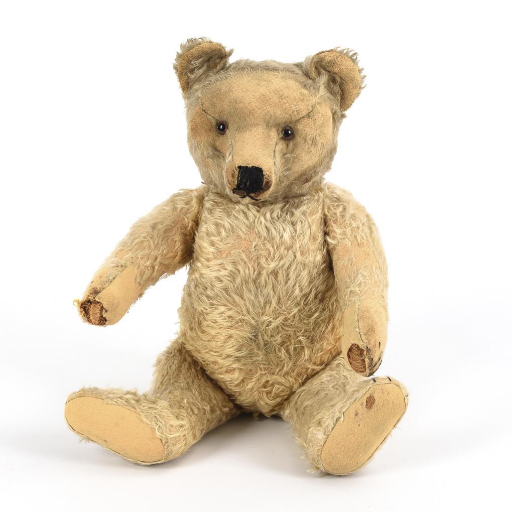 "Original Teddy". Bear with rotating head, glass eyes, felt paws and intact voice. Partially bald, nose re-stitched, paws with defects.