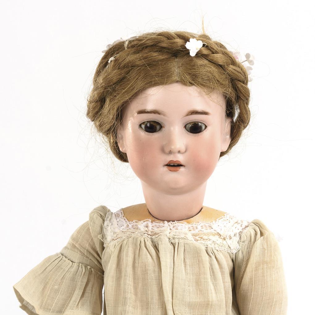 Crank head, brown sleeping eyes, blond eyelashes, light brown human hair wig with braided hairdo. 15-piece articulated body. Cream-colored dress, younger leather boots in the old style. Head x-rayed: without defects, sleep eyes nachgegipst, jammed.