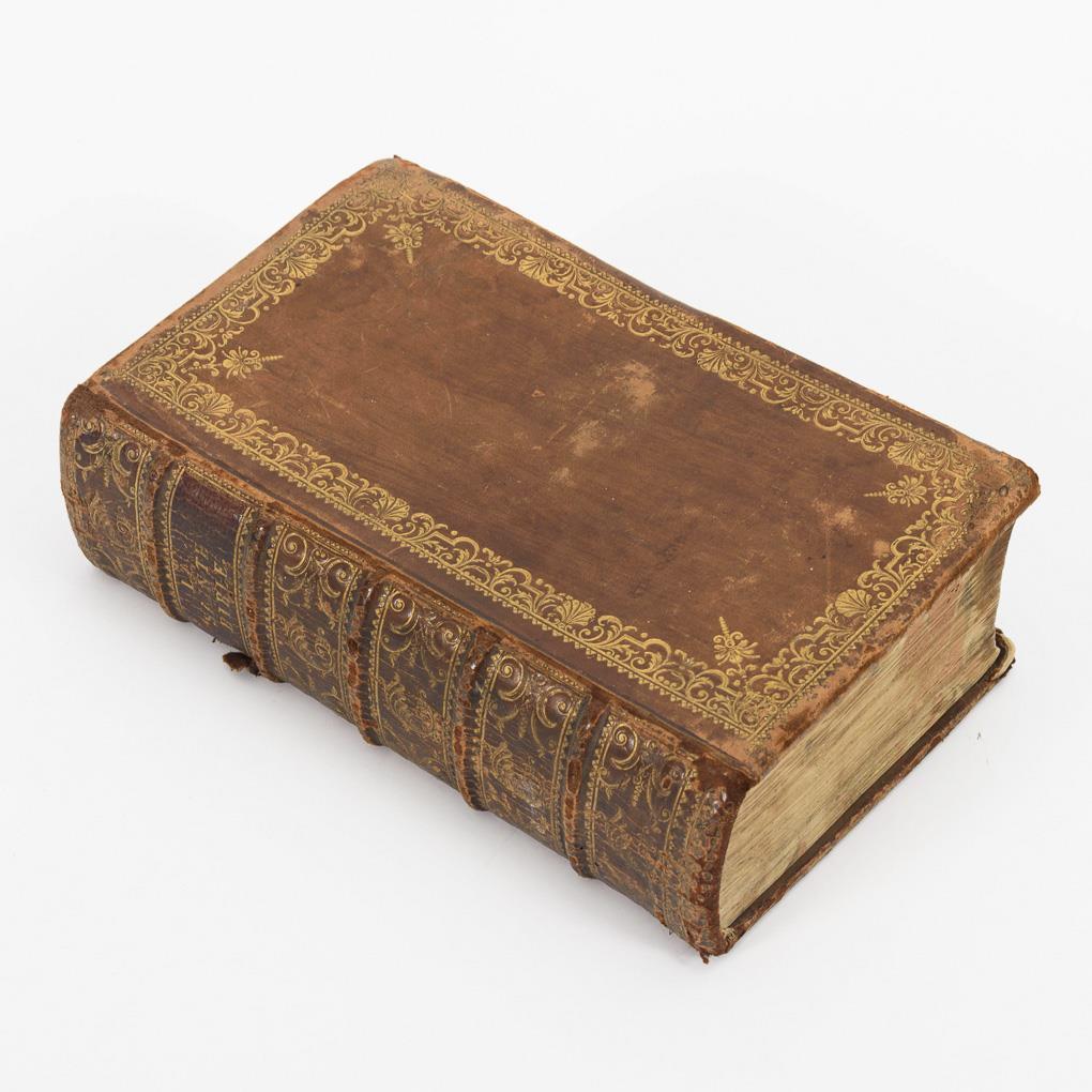 Bibel in französischer Sprache. New edition revised and corr. by Pierr Roques. 7 Blätter im Vor- und Nachsatz eng handschriftlich beschrieben. Goldgeprägter Ledereinband. Alters- und Gebrauchsspuren.