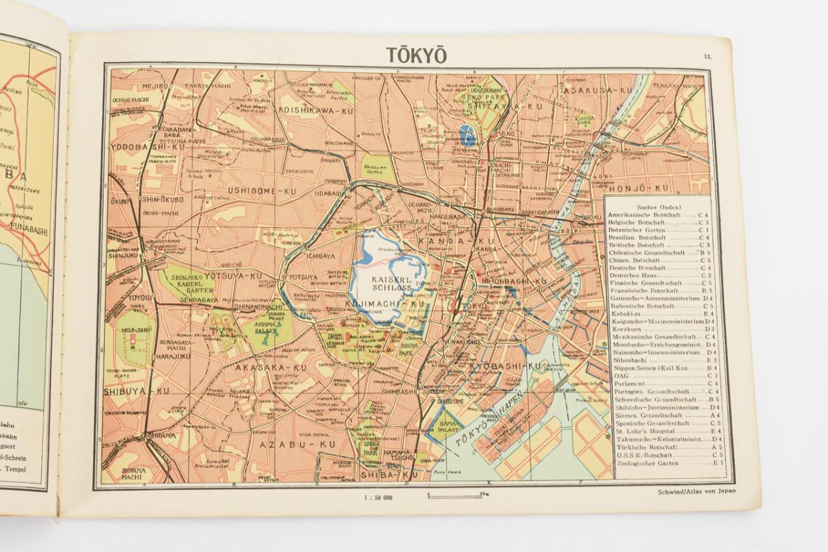 36 pages with maps in color lithographs and 12 index pages. Intended as a school atlas for German schools in Japan and for orientation of traveling salesmen. German names with explanation of Japanese terms. Edition probably only 150 copies. Softcover, age-related traces of use.
