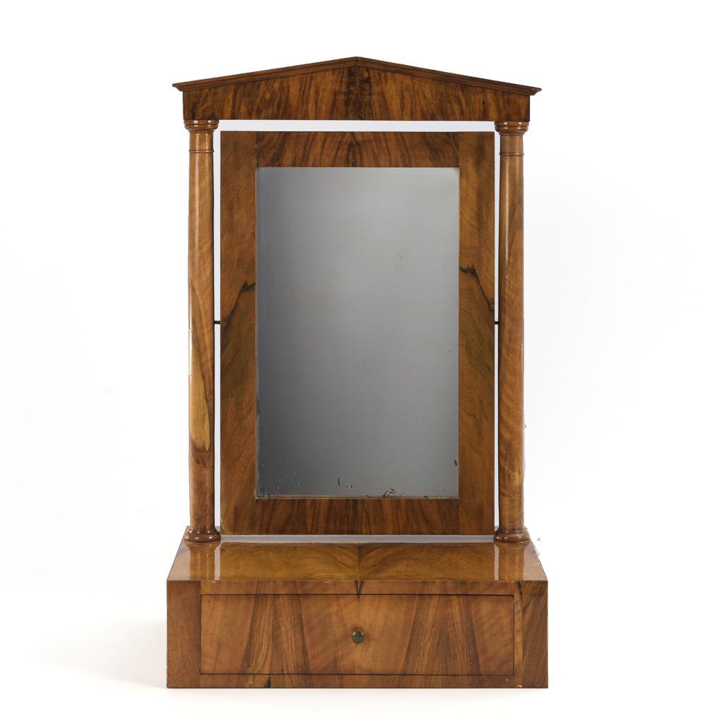 Psyche with swivel mirror in architectural built frame with columns and triangular pediment, on 1-bay box with storage function. Traces of age / use, restored, mirror glass supplemented, small stains.