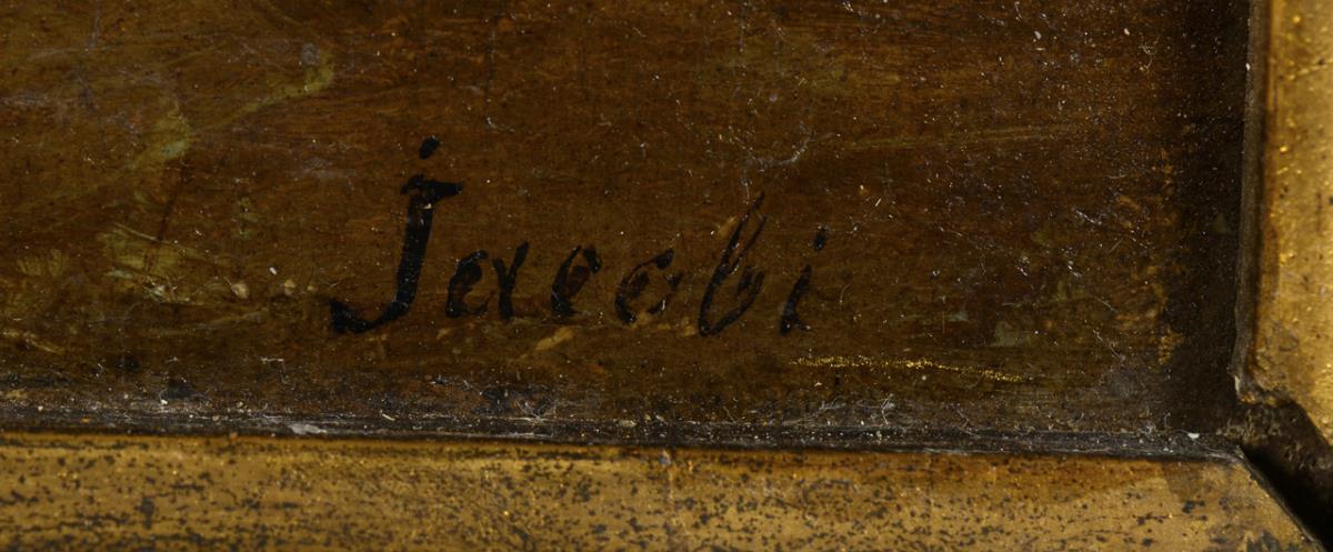 Wide landscape with a small castle on a snowy hill by the icy river. Minimal signs of age.