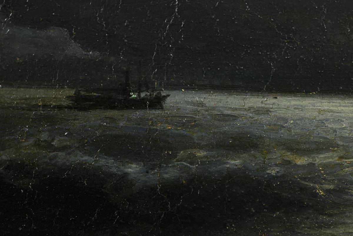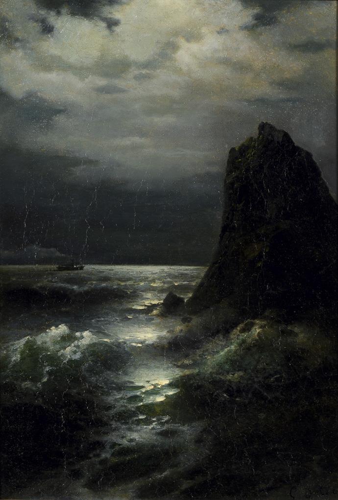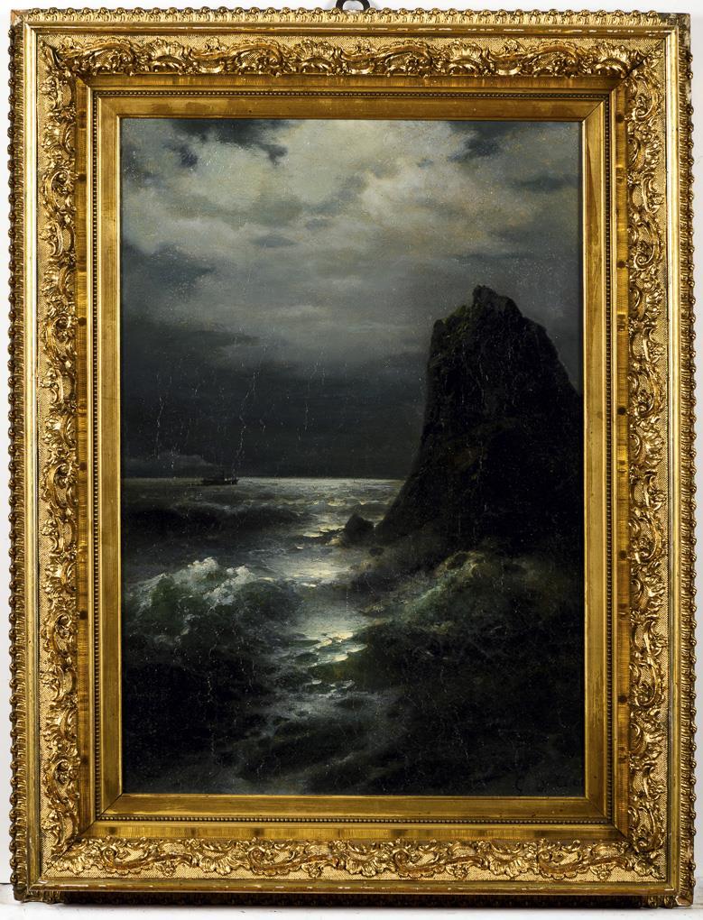 Bright moonlight over the sea with the ship and the shore with rugged rocks. Canvas old mounted.