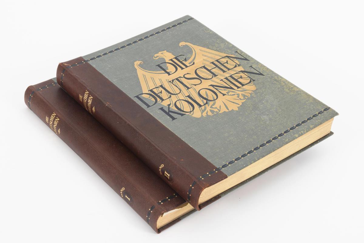 Completely revised edition. Volume I: "The colonies in the age of the world war, Togo, Cameroon, German Southwest Africa. Volume II: "German East Africa, German New Guinea, Samoa, The Protectorate of Kiautschou. Richly illustrated with numerous color photographs. Representative half leather binding with gilt edges.