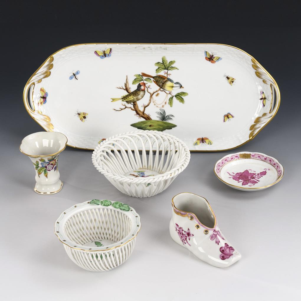 Oval tray with Rothschild decoration (L 36 cm), vase (H 7 cm) and wicker basket (Ø 13 cm) with polychrome Indian floral decoration, small bowl (Ø 9,5 cm) and decorative shoe (L 10,5 cm) with purple Indian floral painting and wicker basket with green Indian floral painting (Ø 10 cm).