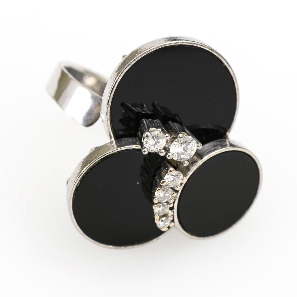 3 onyx discs in open bezel settings and 6 chaton set diamonds on open sided center rail.