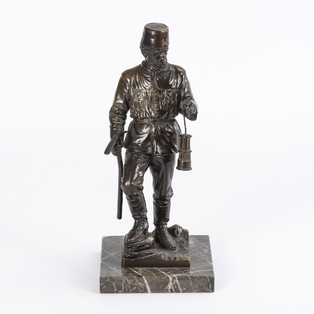Standing miner in uniform with cross hoe and miner's lamp. 1 scratch.
