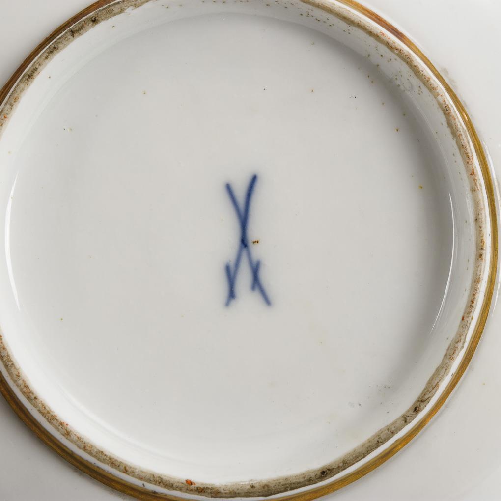 Saucer of a trembleuse with openwork stand ring and floral and insect painting. Minimal gold abrasion on the rim.