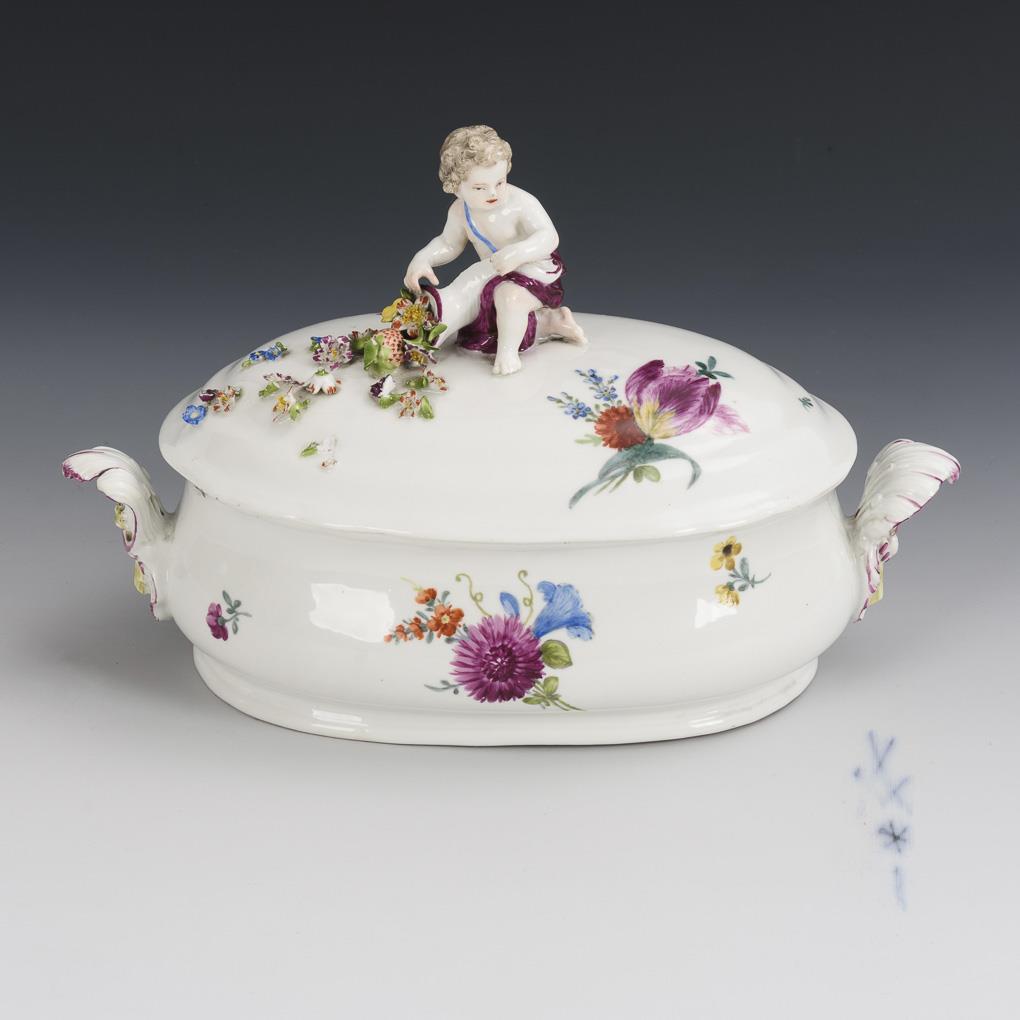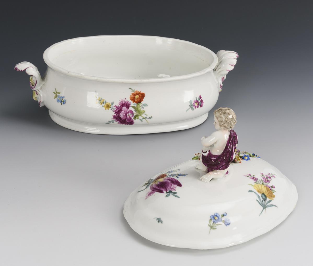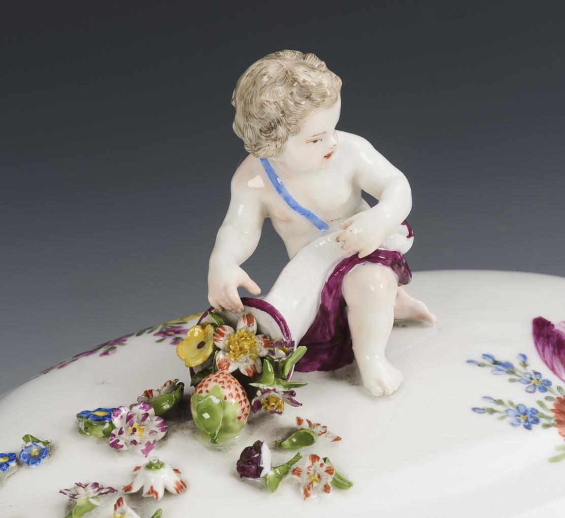 Oval tureen with two rocaille handles and a putto with cornucopia as lid knob. Floral painting. bumps on flowers and leaves on all sides.
