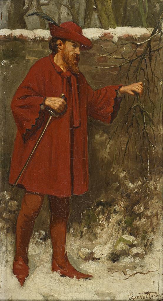 Probably Mephisto in red robe with feathered hat as well as with rapier in front of the wall in winter. 1 small dry tears, some shrinkage cracks.