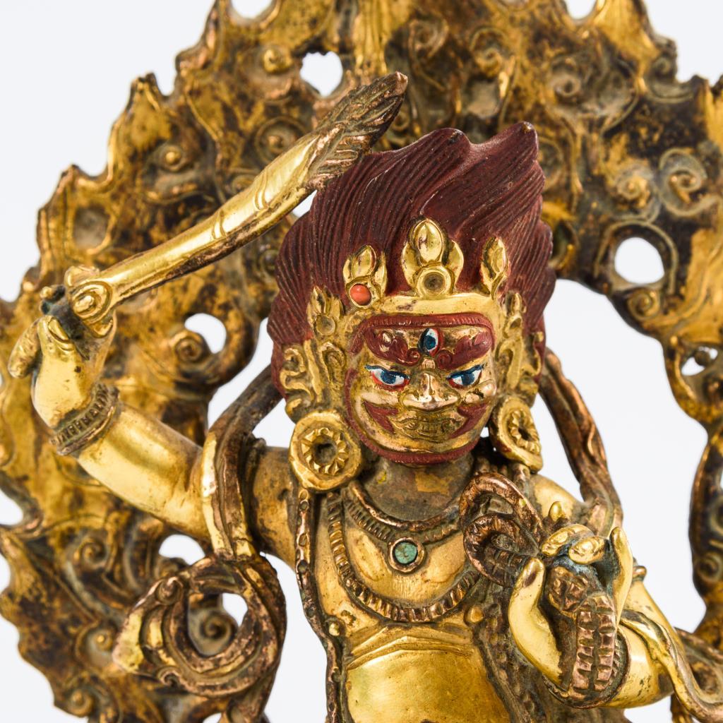 Figur mit Flammenschwert und Fangschlinge. Mandorla einsteckbar, Boden verschlossen. Gesicht und Haare farbig.