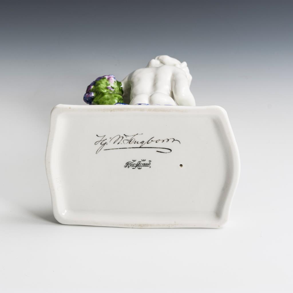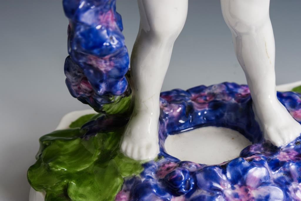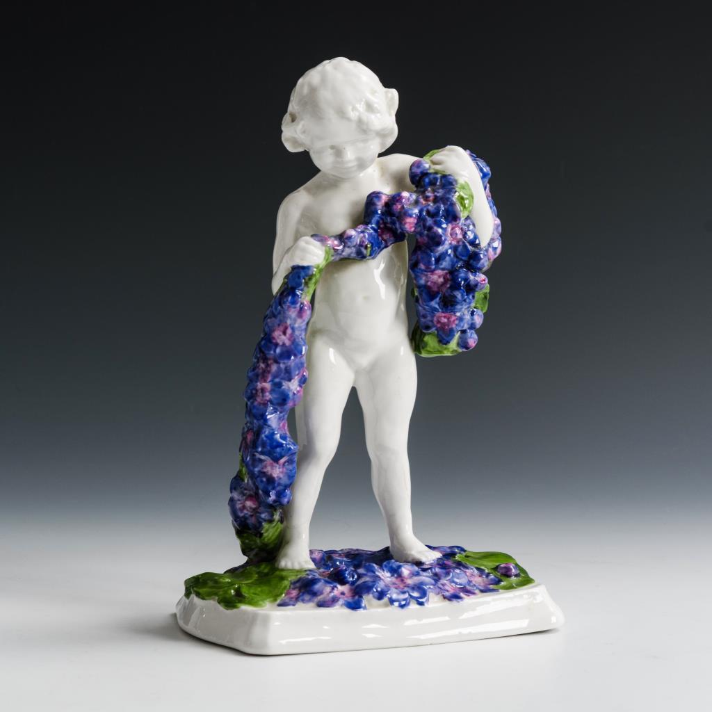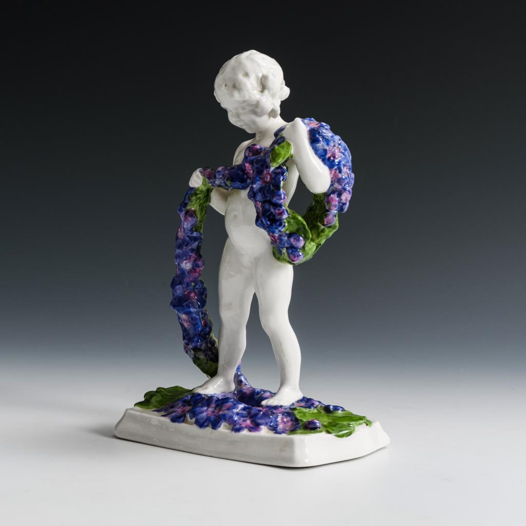 Unbekleidetes Kind mit großer Blütengirlande, auf rechteckigem Sockel. Haarriss oberhalb des rechten Knöchels.