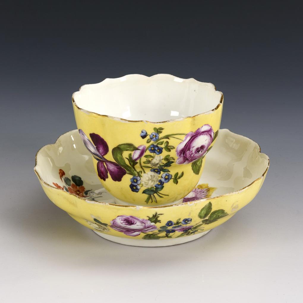 Form "New Cutout". With lemon yellow background, floral bouquets and small flower stems. Glaze chipping, partially rubbed, stand ring of the cup bumped.