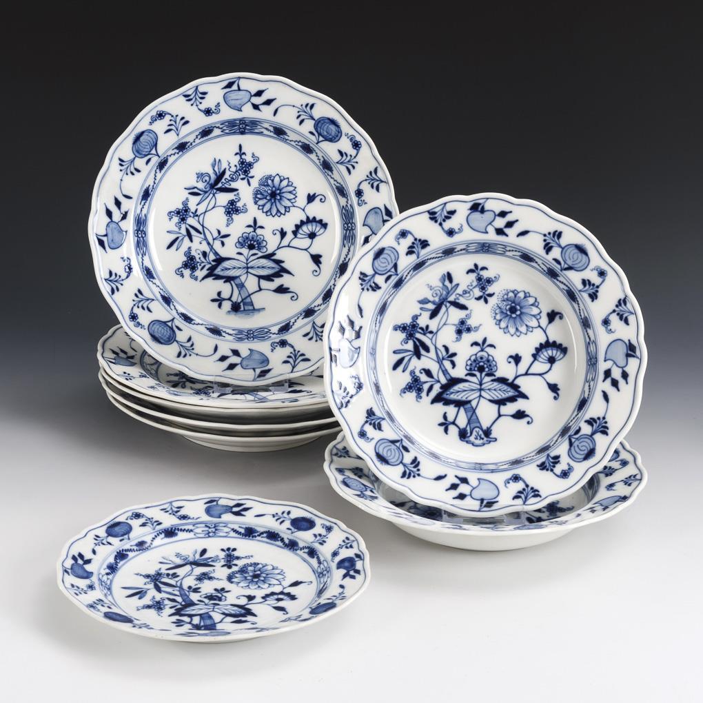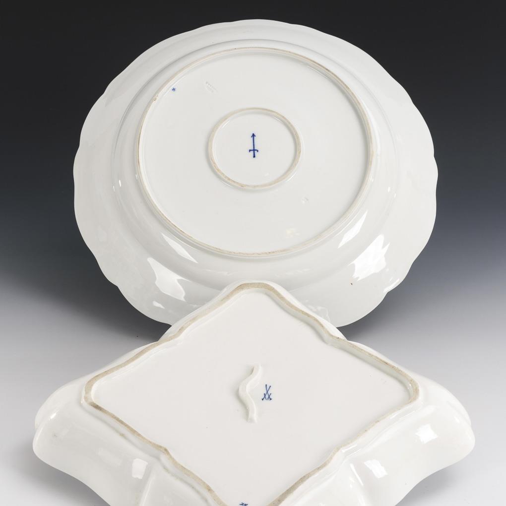 Form "New Cutout". 5 dinner plates (Ø ca. 24,5 cm), 2 soup plates (Ø 24 cm), 1 salad plate (Ø 21 cm), 1 square bowl (27 x 27,5 cm) and 1 vegetable plate (Ø 35 cm). Hairline crack on the edge of the square bowl.