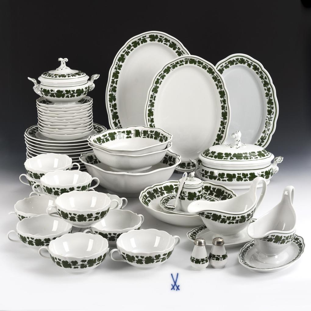 48 parts. Form "New Cutout". 11 dinner plates, 11 soup cups with 11 saucers, 3 oval plates (L 35, 36 and 41,5 cm), 3 square bowls (2x 23 x 21,5 cm and 1x 26,5 x 27,5 cm), 2 sauce boats (L 22 cm), 1 oval lidded bowl (L 28 cm), 1 small tureen (Ø 22 cm), 2 spice shakers, 1 round bowl (Ø 25,5 cm) and 1 mustard pot with spoon. Chip on the edge of the lid of the tureen, rose knob of the mustard pot lid bumped, chip on 3 saucer edges.