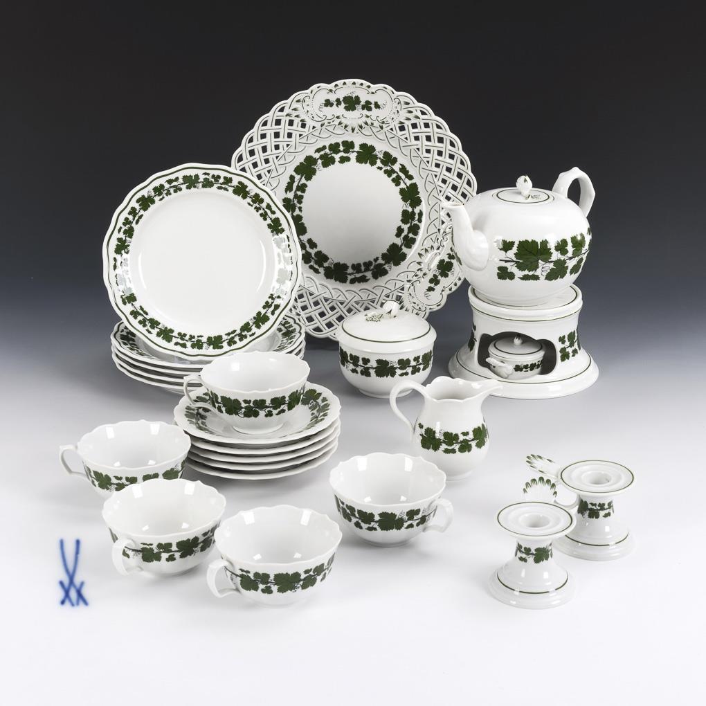 22 parts. Form "New Cutout". Teapot (h 12.5 cm), creamer, sugar bowl, 5 tea cups, 5 saucers, 5 breakfast plates, 1 teapot warmer with burner, 1 breakthrough plate (Ø 28.5 cm) and 2 candlesticks. Minimal bumping on the teapot rim, sugar bowl knob and 1 cup rim, 1 cup rim with 2 bumps.