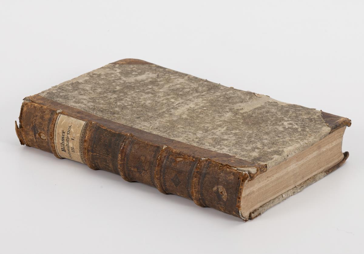 Pre-title and title page with copper engraving, (8), 18, 804 pages. Commentaries on the jurisprudence in German. Half leather binding. Exterior heavier signs of use and abrasion, spine slightly torn, otherwise good condition.