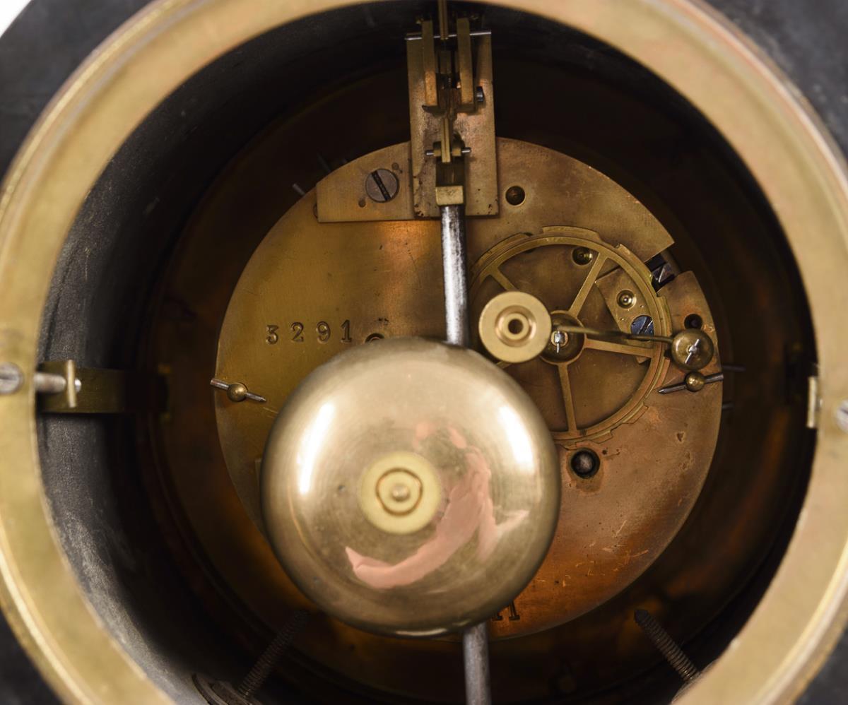 "Vincenti & Cie" marked movement with half hour strike on bell, starts. White enamel dial ring with Arabic numerals, minute crown and Romaines hands, recessed center with cube pattern and visible Brocot escapement.