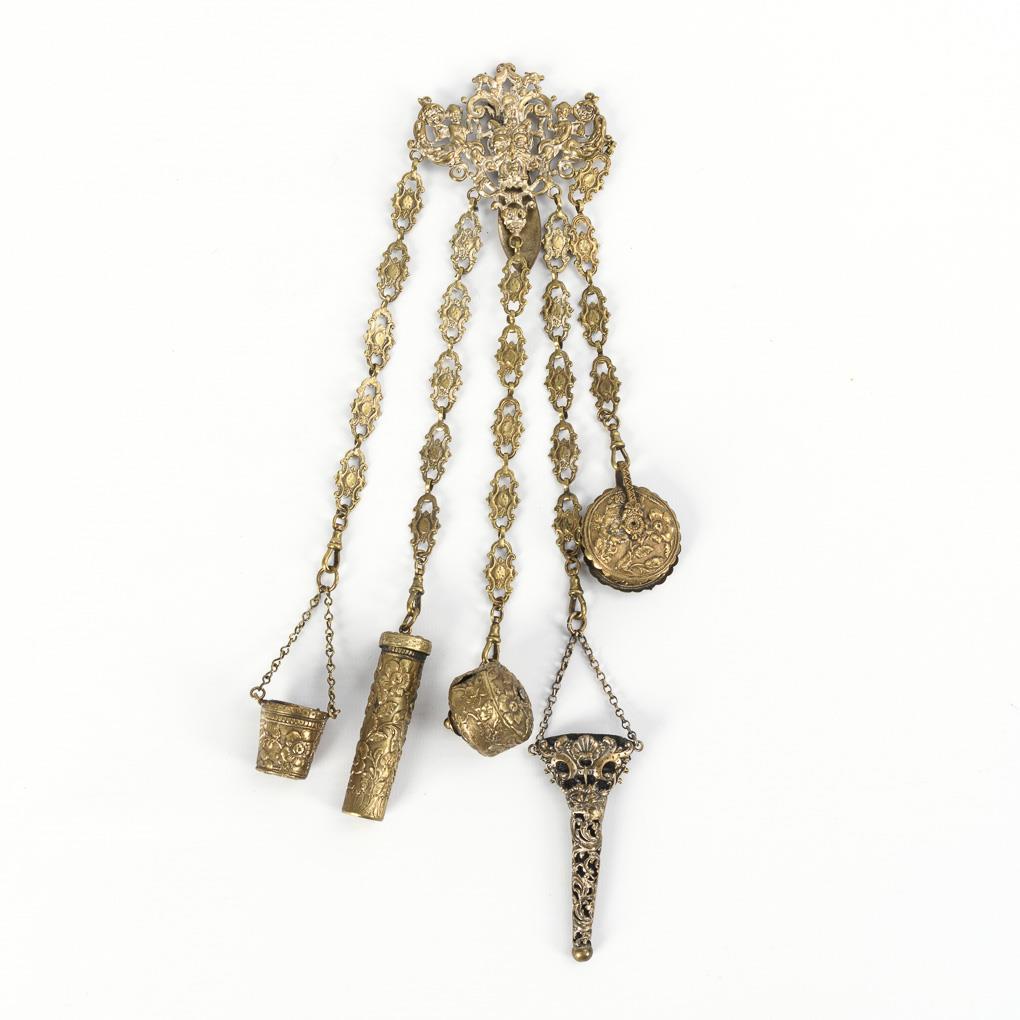 Brace with mascaron and putti herms, on decorative chains bucket with thimble, needle case, measuring tape, scissors case and pliers. Scissors missing, measuring tape retracted, rubbed.