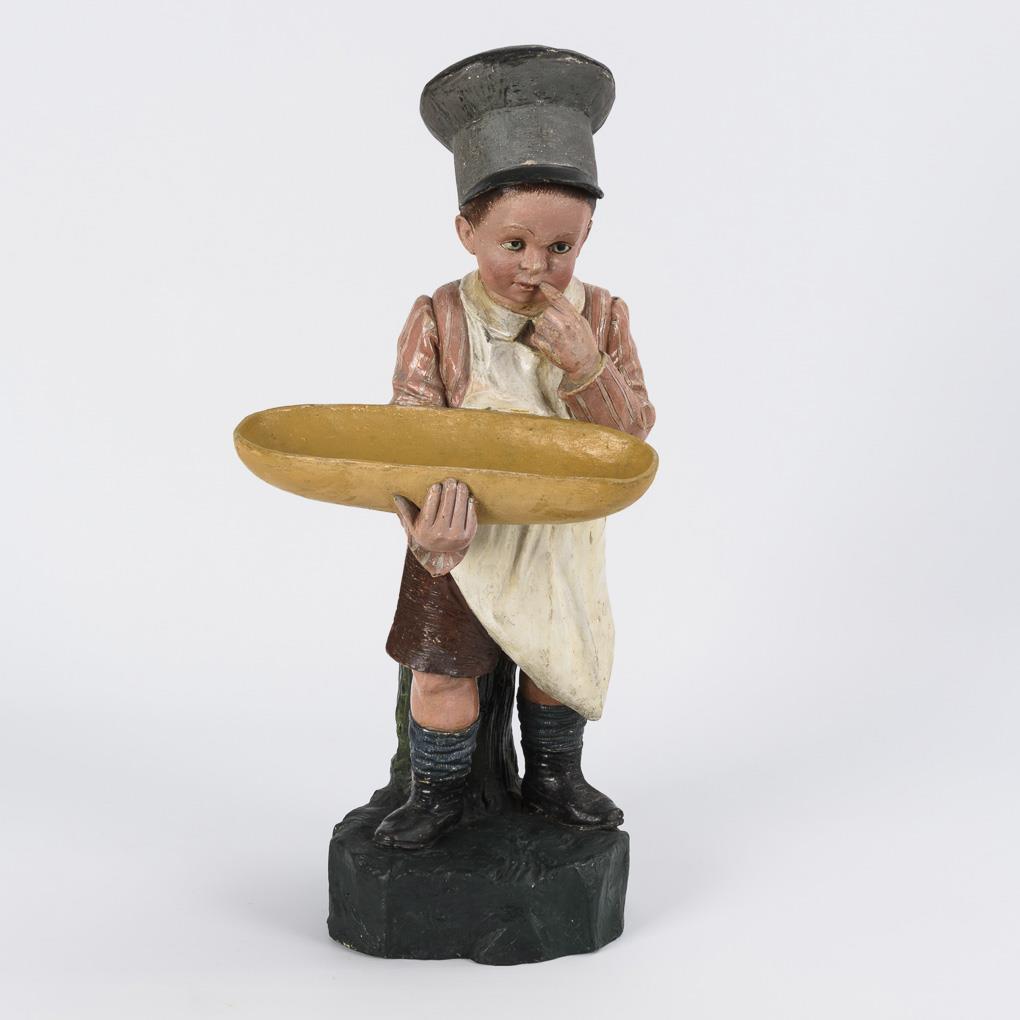 Standing boy with white apron and black chef's hat, holding a meat trough, on natural base. Embellishments, overpaintings.