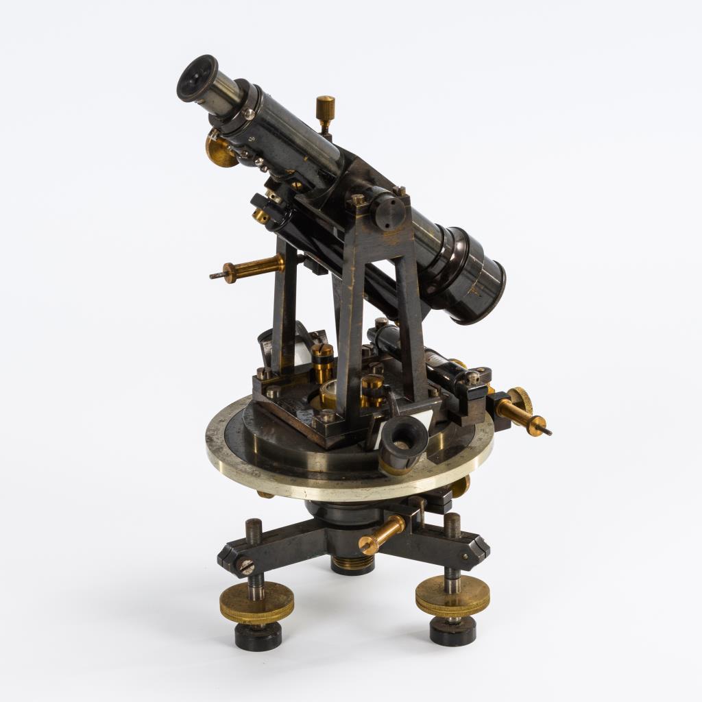 3-beiniger Fuß mit Libelle, Vollkreis, 2 Lupen über Nonien sowie Feinbewegungen. Fernrohr mit Libelle, Objektivkappe sowie Absehe. Wenige Alters-/Gebrauchsspuren.