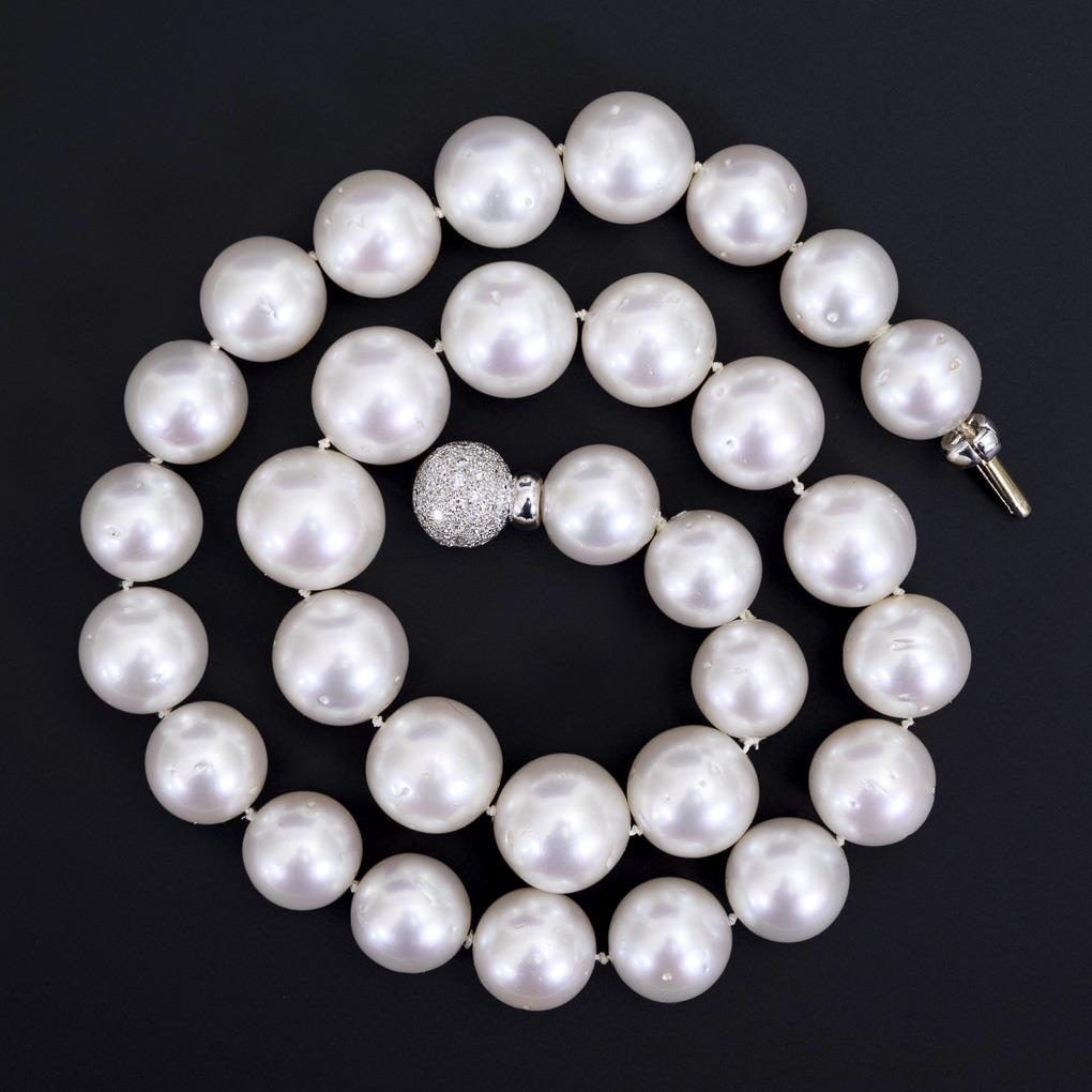 Lacing necklace with large cultured pearls in single knotting, on ball clasp with diamonds in pavé setting. Pearls sporadically with growth spots.