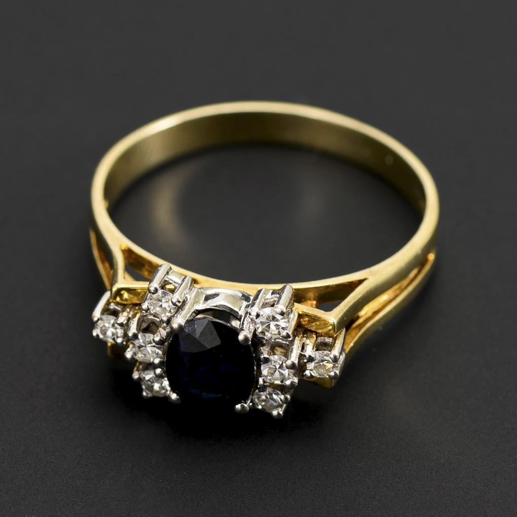 Chaton set sapphire surrounded by 8 small diamonds, between center rail.