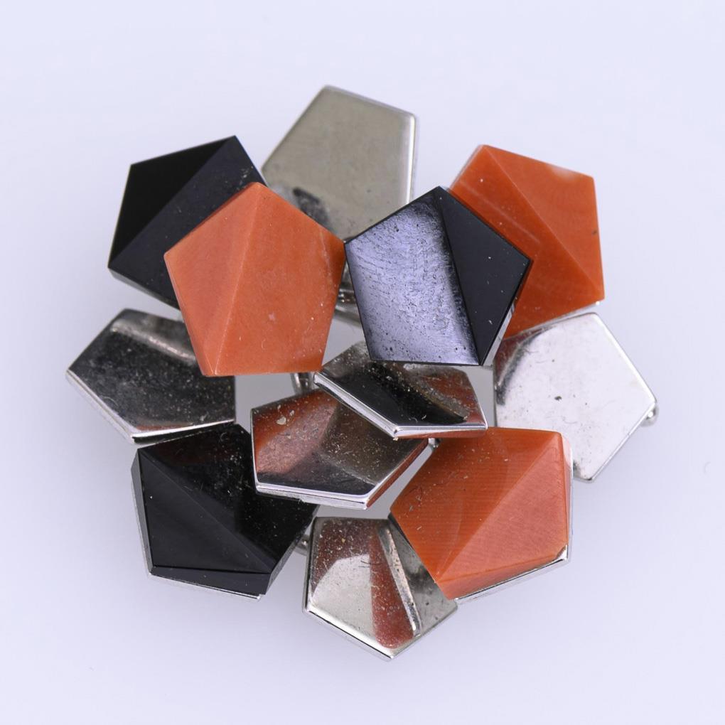 Stylized flower brooch with 3 coral and onyx segments. Sliding hook.