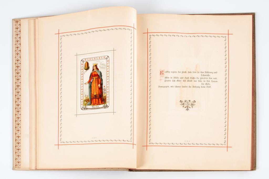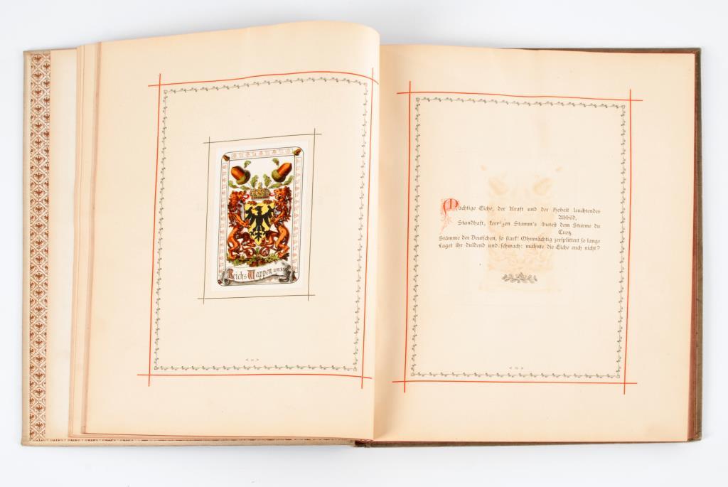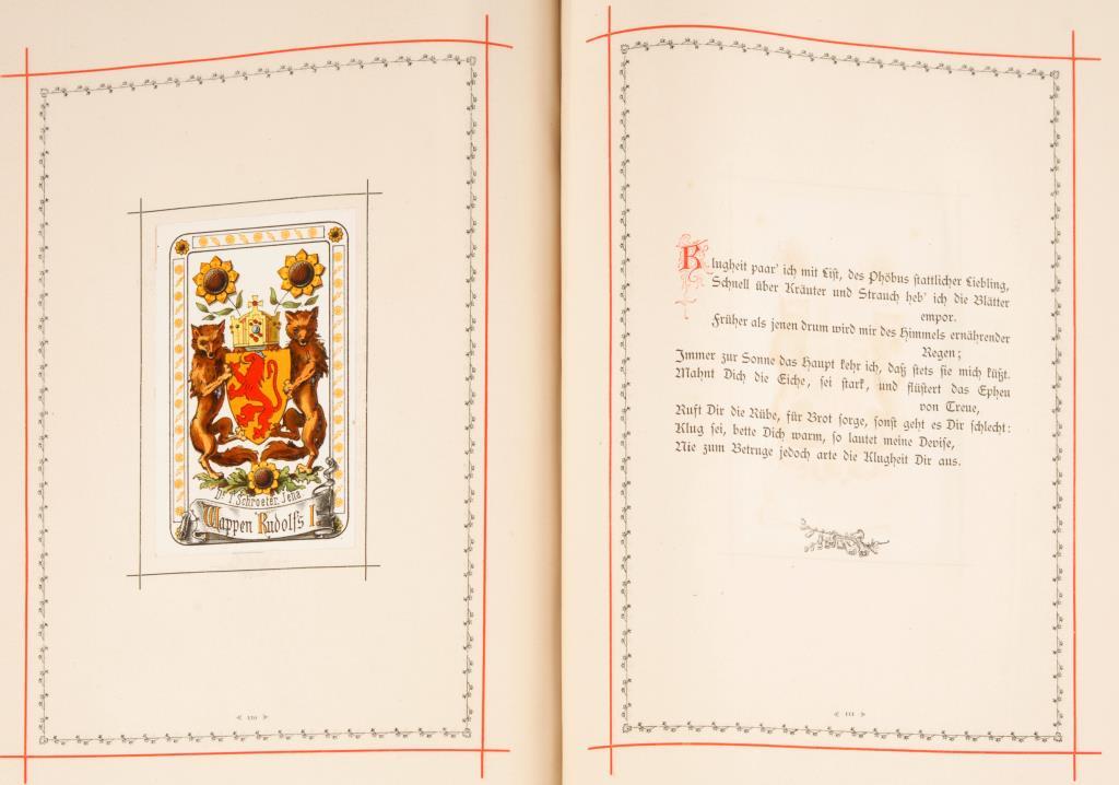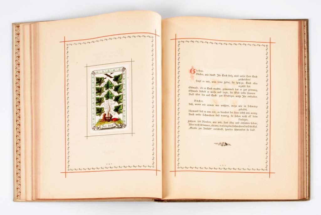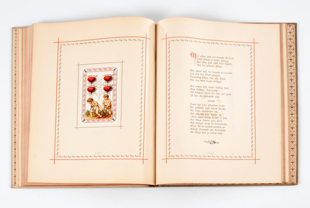 139 Seiten. Mit 56 Spielkarten-Farblithographien, montiert nach Zeichnungen von J. Hirsch und M. Lämmel. Auf dem Titelblatt Widmung des Verfassers. Gedicht- und Erklärungsband zur "Neuen Deutschen Spielkarte". Die Daus-Karten (Asse) zeigen die Wappen der vier Königskarten, im Einzelnen Karl der Große (Eichel), Friedrich Barbarossa (Efeu), Maximilian I. (Rübe) und Rudolf von Habsburg (Sonnenblume). Geprägter Leineneinband mit leichten Altersspuren.