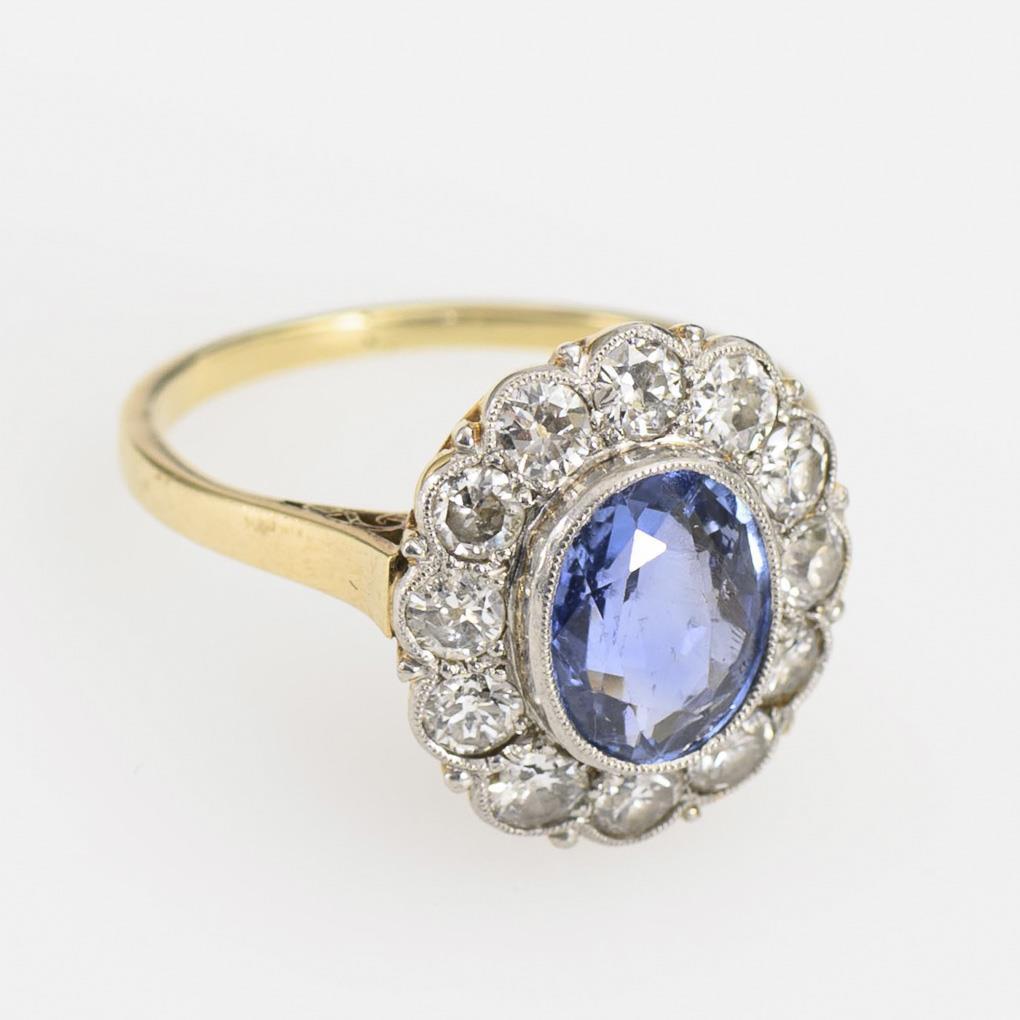 Entourage ring with sapphire and 12 old-cut diamonds, between narrow rail. Sapphire on the side 2 small chips.