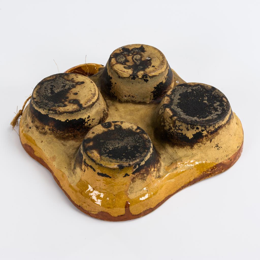 Quadratische Form mit 4 Buchteln und seitlichem Henkel. Leichte Alters- und Gebrauchsspuren.