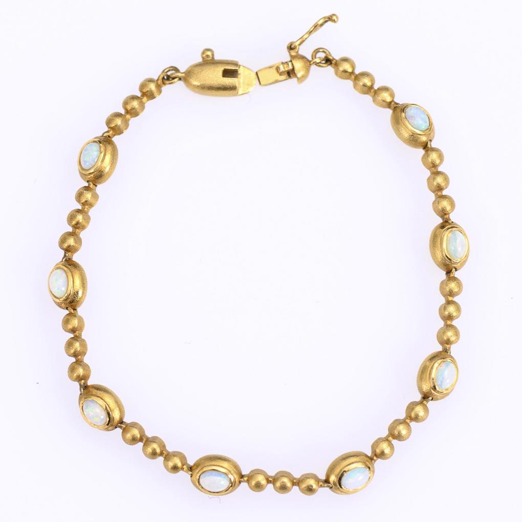 8 bezel-set opal cabochons between small hemispherical links. Box lock with figure-eight safety .