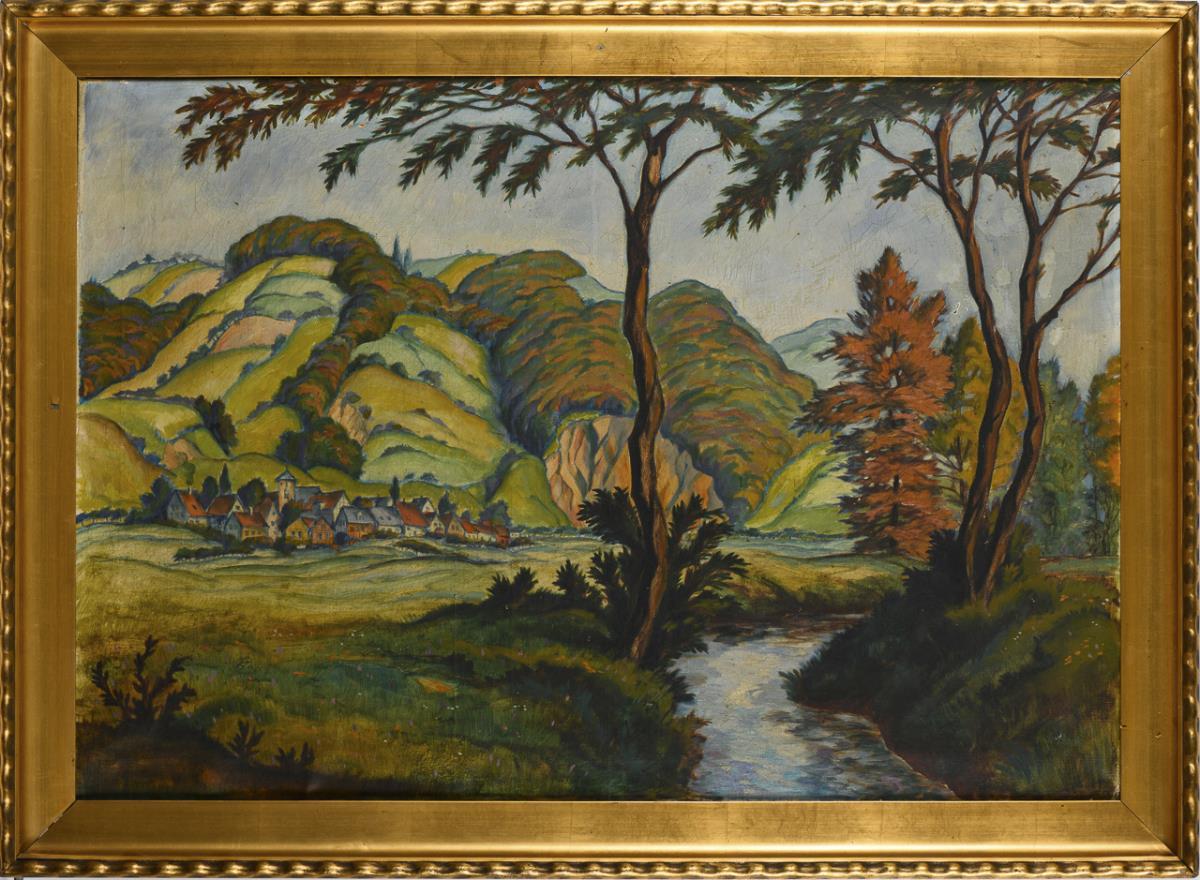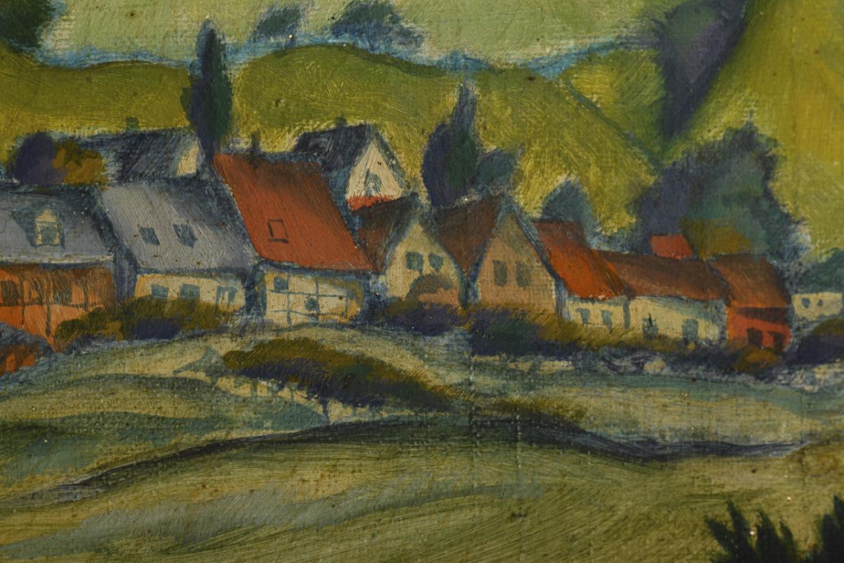 Expressively painted autumnal landscape with village in front of the mountainside. Traces of age.