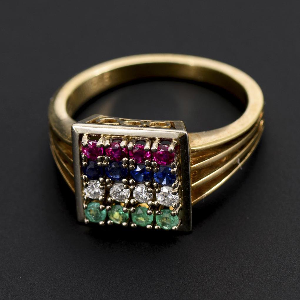 4 chaton set emeralds, diamonds, sapphires and rubies between 4-bar shoulder and center rail.