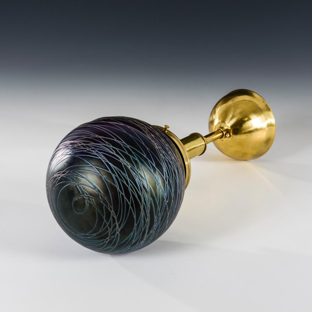 Sezessionistische Lampe mit kugeligem Schirm sowie Messinghalterung mit verstellbarem Baldachin. 2 kleine Bestoßungen am Schirmrand.