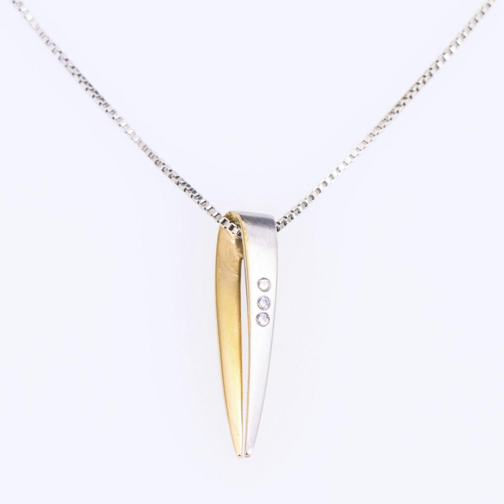 Pendant yellow gold 750 stamped. Chain white gold 585 stamped. Pendant 2.7 x 0.6 cm. Chain L 52 cm. Diamonds together 0.03 ct. Pendant 3,1 g. Chain 3,5 g.